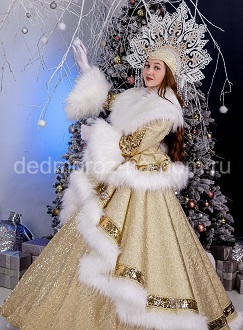 Снегурочка в золотом костюме является неотъемлемым компаньоном Деда Мороза в «Таёжном» костюме. Красивая и переливающаяся ткань, из которой выполнен костюм, заворожит любого!